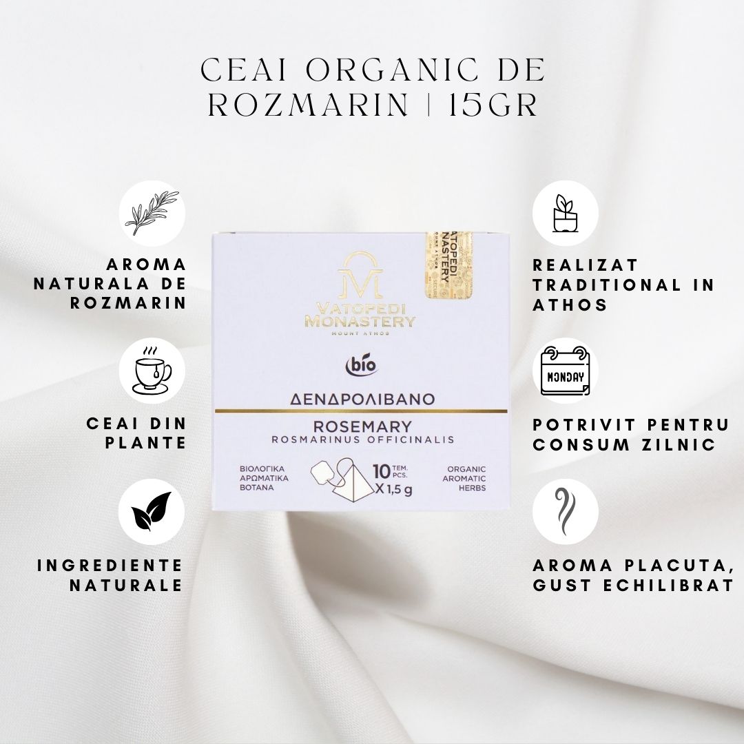 Ceai din plante cu aroma naturala de rozmarin, intensa si placuta, potrivit pentru consum zilnic. Pliculete cu plante uscate, usor de preparat, ideal pentru o pauza aromata acasa sau la birou.
