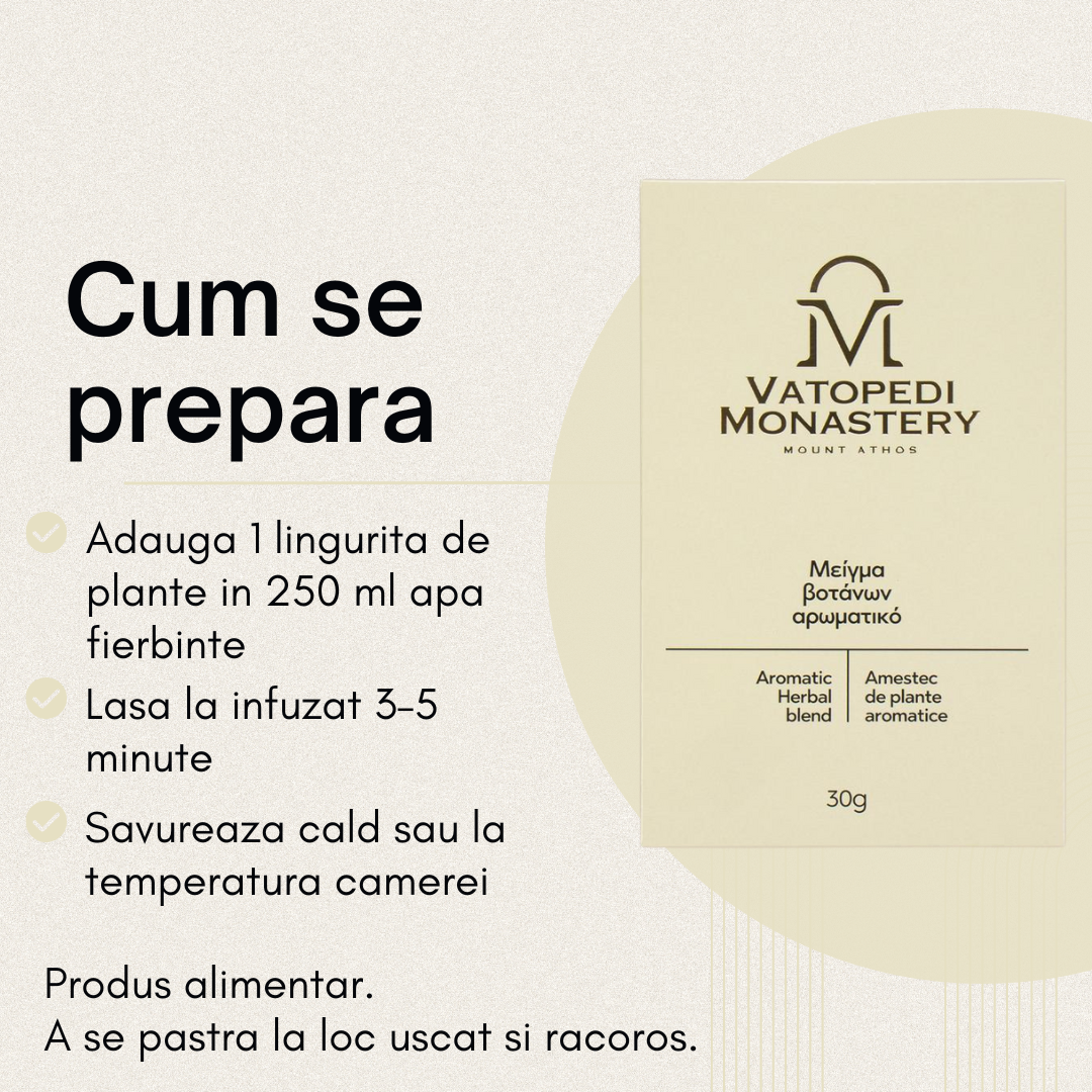 Adaugati 1 lingurita de plante in 250 ml apa fierbinte. Lasati la infuzat 3–5 minute, intr-o cana sau ibric, apoi strecurati. Se poate consuma cald sau la temperatura camerei.