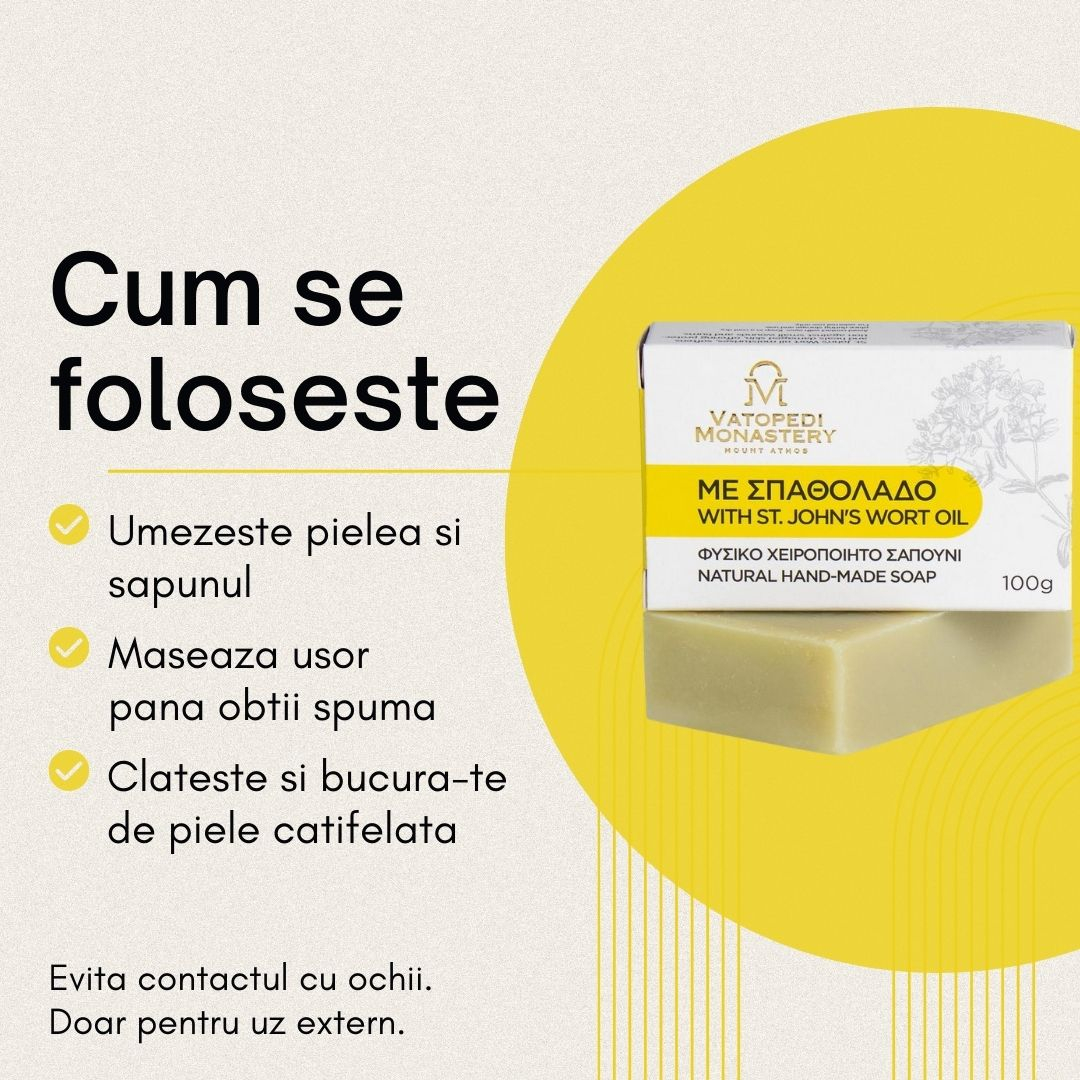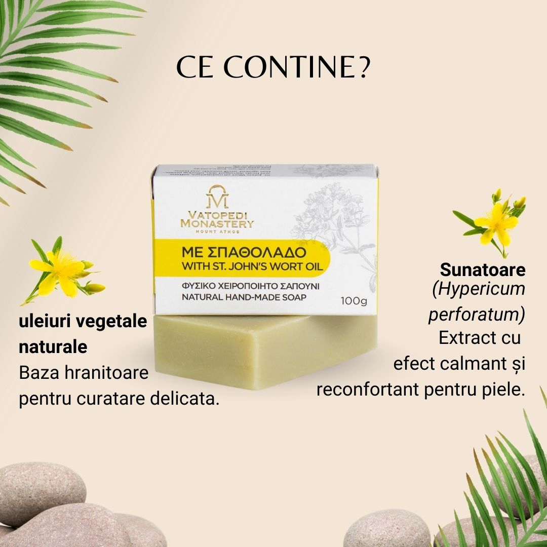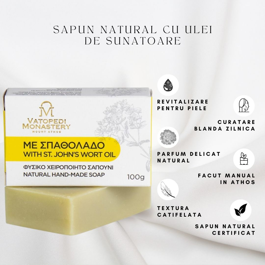 Sapun natural realizat manual in Manastirea Vatopedi, Sfantul Munte Athos, imbogatit cu ulei de sunatoare. Curata delicat pielea, o calmeaza si o lasa catifelata, fiind ideal pentru folosirea zilnica, inclusiv pe pielea sensibila.