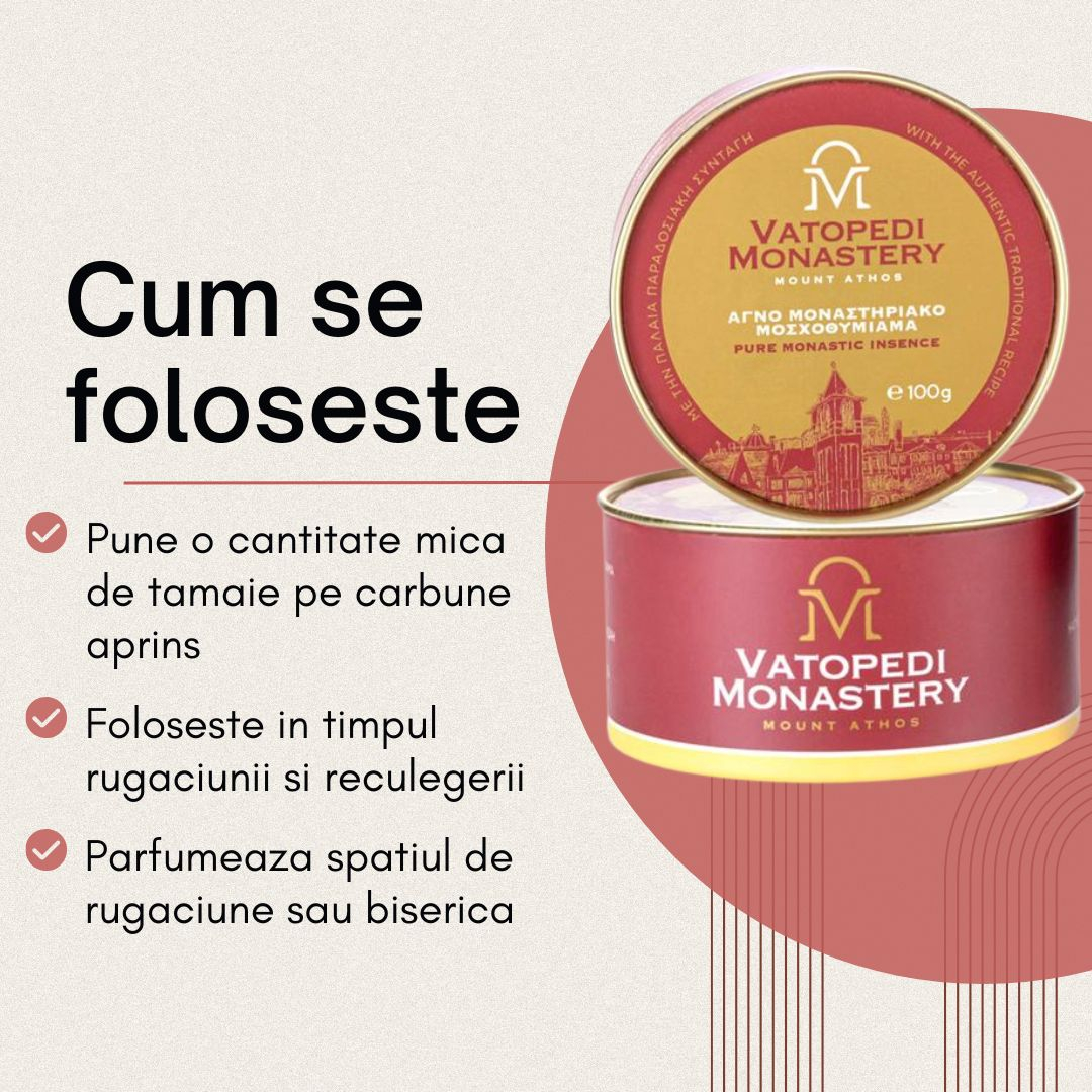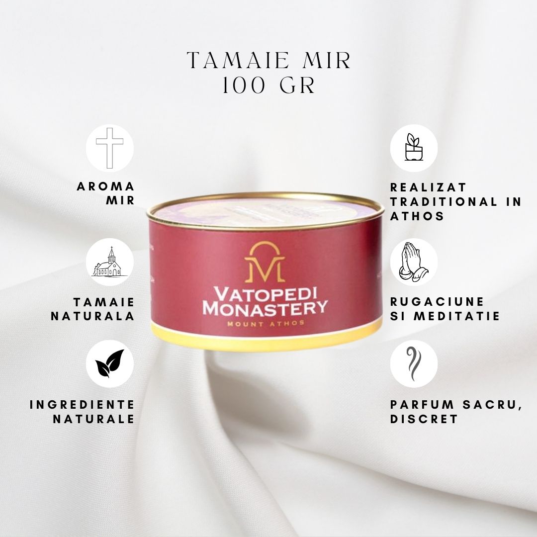 Tamaie monahala autentica, realizata in Manastirea Vatoped din Sfantul Munte Athos, cu esenta de Mir. Parfumul este cald, bogat si armonios, potrivit pentru rugaciune, slujbe si binecuvantarea spatiului. Cutia contine 10 cutii a cate 100 g, ideala pentru biserici, manastiri sau utilizare frecventa acasa.