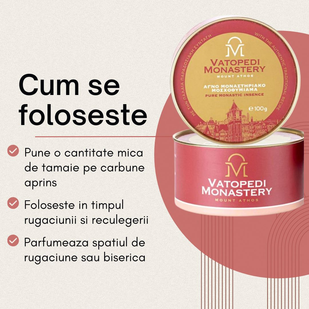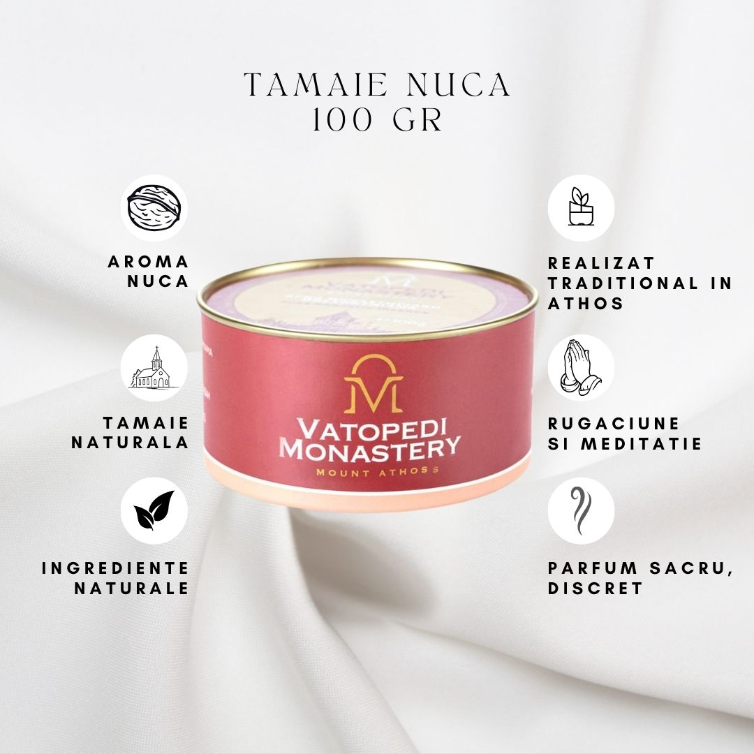 Cutie avantajoasa cu tamaie monahala de la Manastirea Vatoped, din Sfantul Munte Athos, in aroma de nuca. Tamaia este realizata dupa reteta traditionala monahala, din amestec de rasini si esente naturale, oferind un parfum cald, discret si echilibrat, potrivit pentru rugaciune, slujbe si binecuvantarea spatiului.