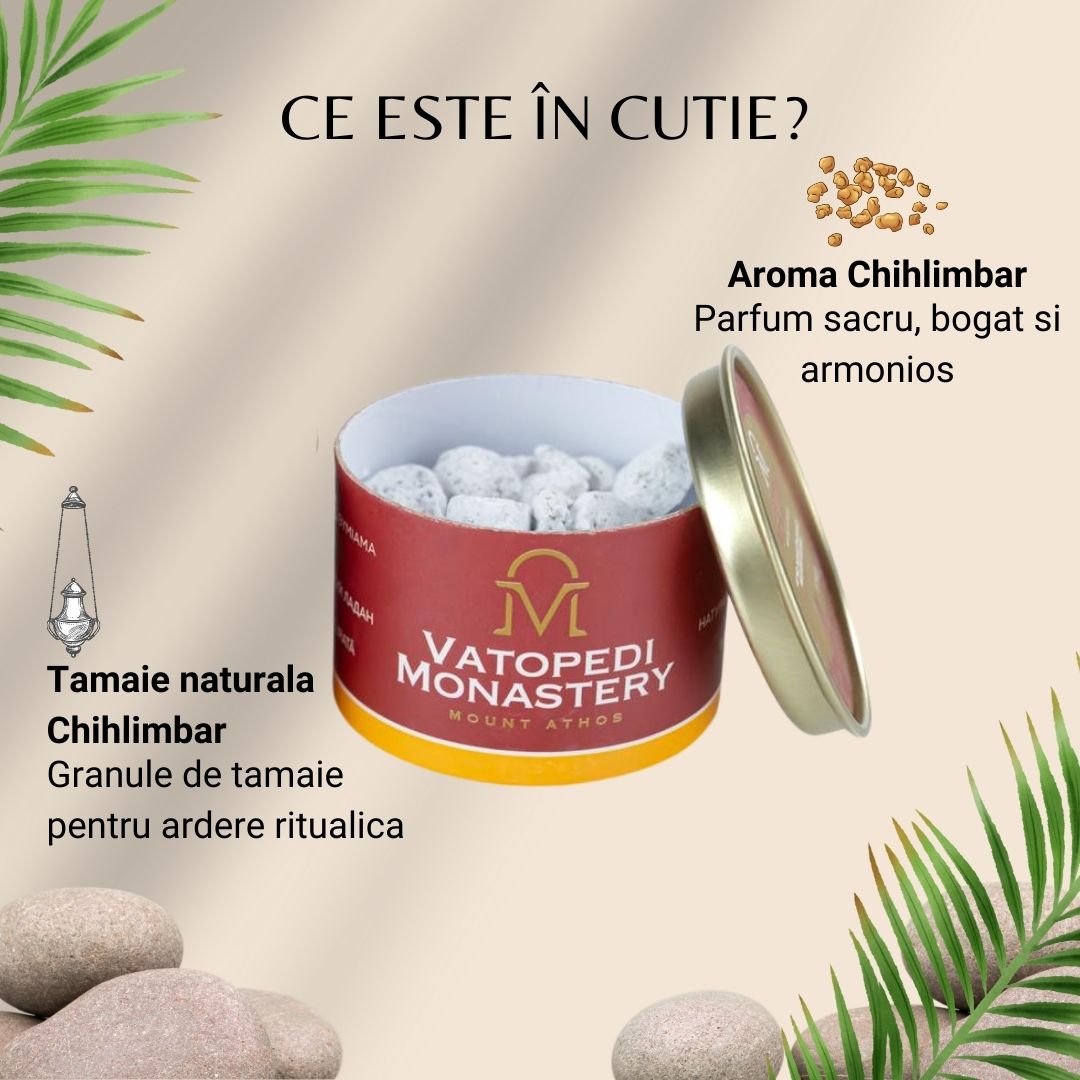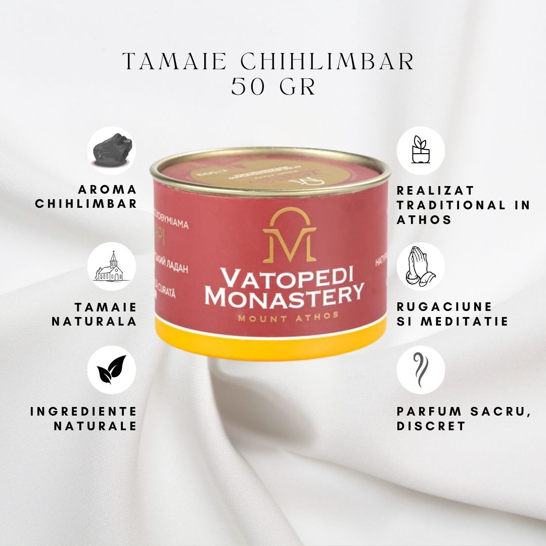 Tamaie monahala de la Manastirea Vatoped (Sfantul Munte Athos), cu essenta de chihlimbar, realizata din amestec de rasini si esente naturale conform traditiei monahale. Parfum cald, bogat si profund, potrivit pentru rugaciune, reculegere si binecuvantarea spatiului, cu fum echilibrat si aroma persistenta.