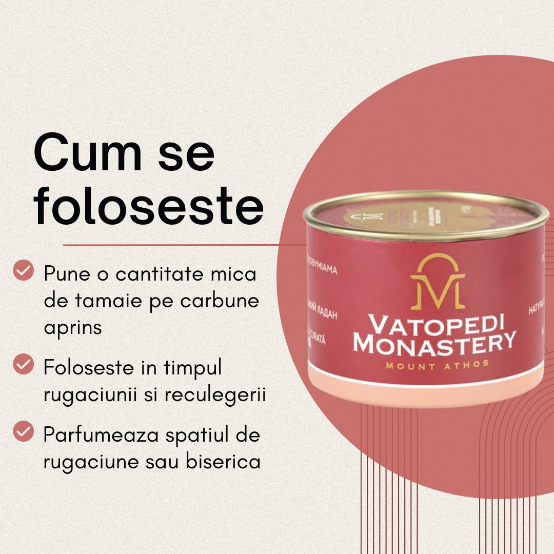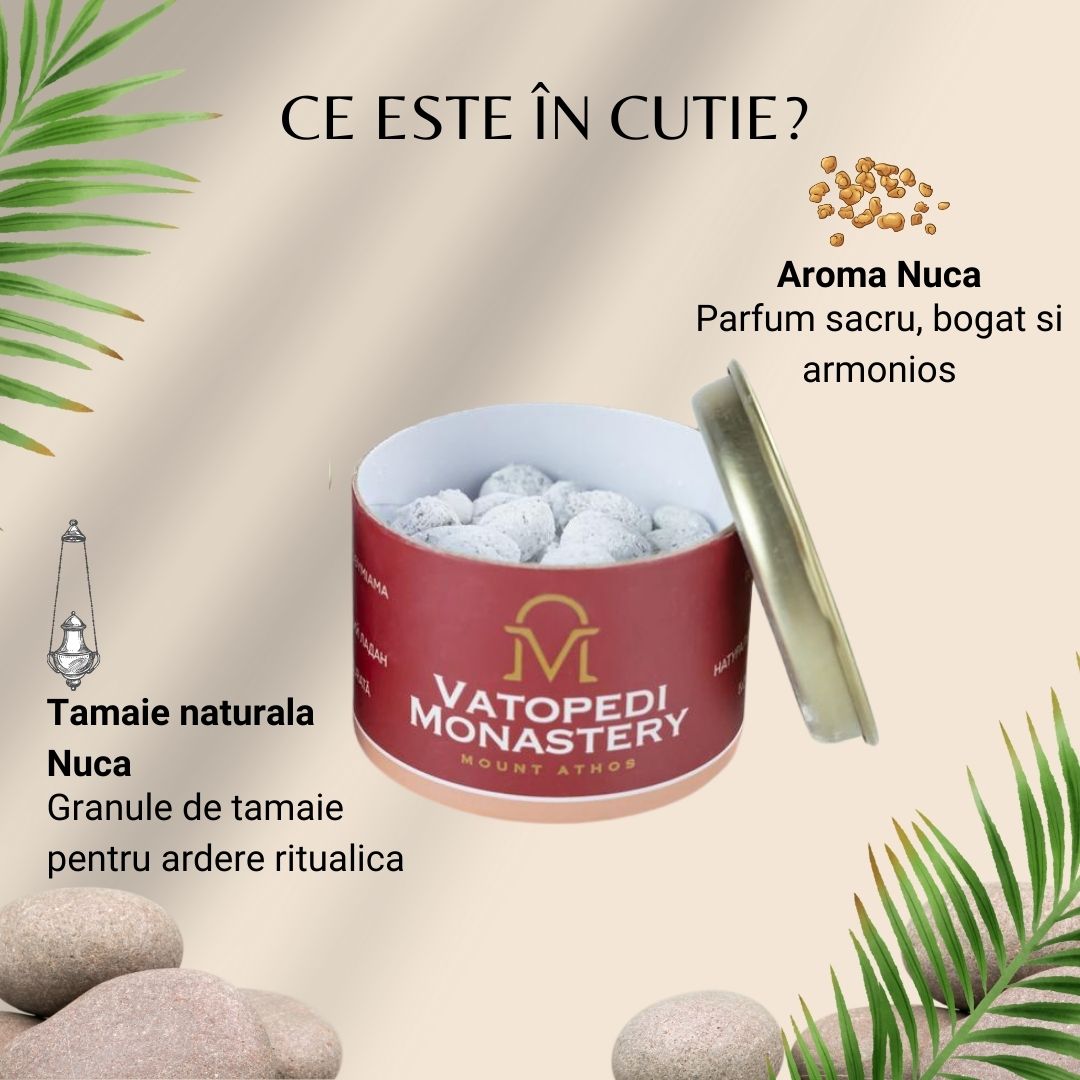 Tamaie monahala cu aroma de nuca, calda si discreta, realizata din amestec de rasini si esente naturale, dupa reteta traditionala pastrata in mediul monahal. Potrivita pentru rugaciune, reculegere si binecuvantarea spatiului, cu fum echilibrat si parfum placut, de durata.
