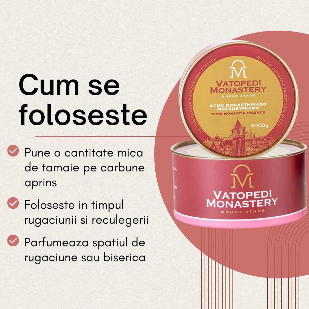 Tamaie monahala autentica, realizata in Manastirea Vatoped din Sfantul Munte Athos, cu aroma delicata si florala de trandafir. Aceasta tamaie ofera o prezenta placuta si echilibrata, creand o atmosfera linistitoare si curata, potrivita pentru rugaciune, meditatie si binecuvantarea spatiului.
