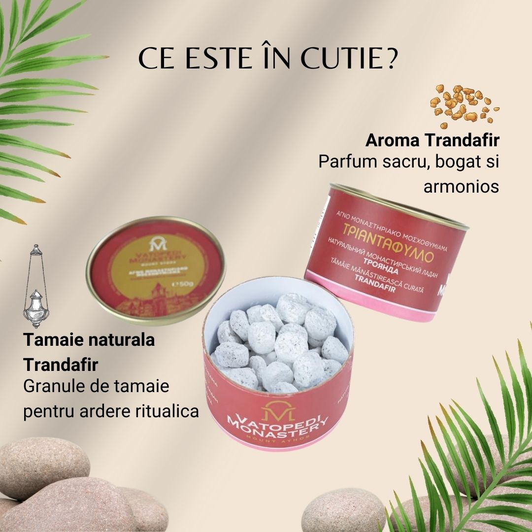 Tamaie monahala autentica, realizata in Manastirea Vatoped din Sfantul Munte Athos, cu aroma delicata si florala de trandafir. Aceasta tamaie ofera o prezenta placuta si echilibrata, creand o atmosfera linistitoare si curata, potrivita pentru rugaciune, meditatie si binecuvantarea spatiului.