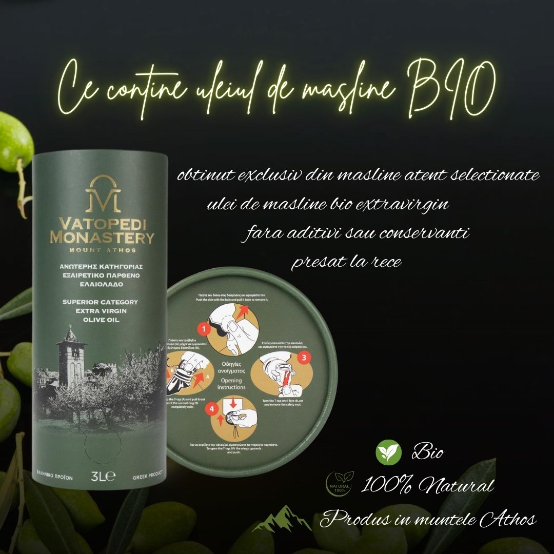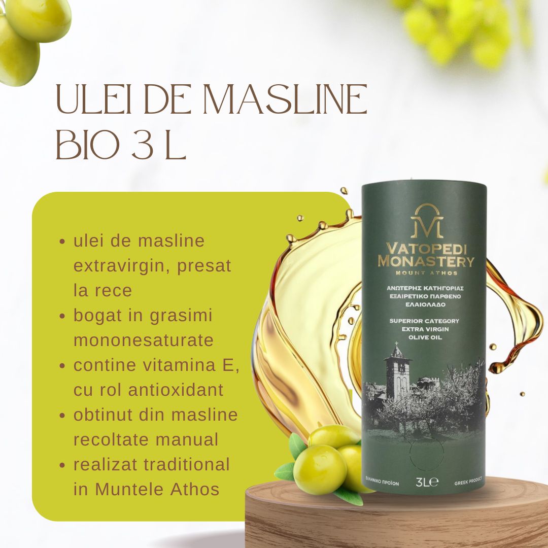 Ulei de masline extravirgin autentic din Sfantul Munte Athos, cu aroma naturala si calitate superioara. Potrivit pentru salate, gatit si alimentatie sanatoasa.